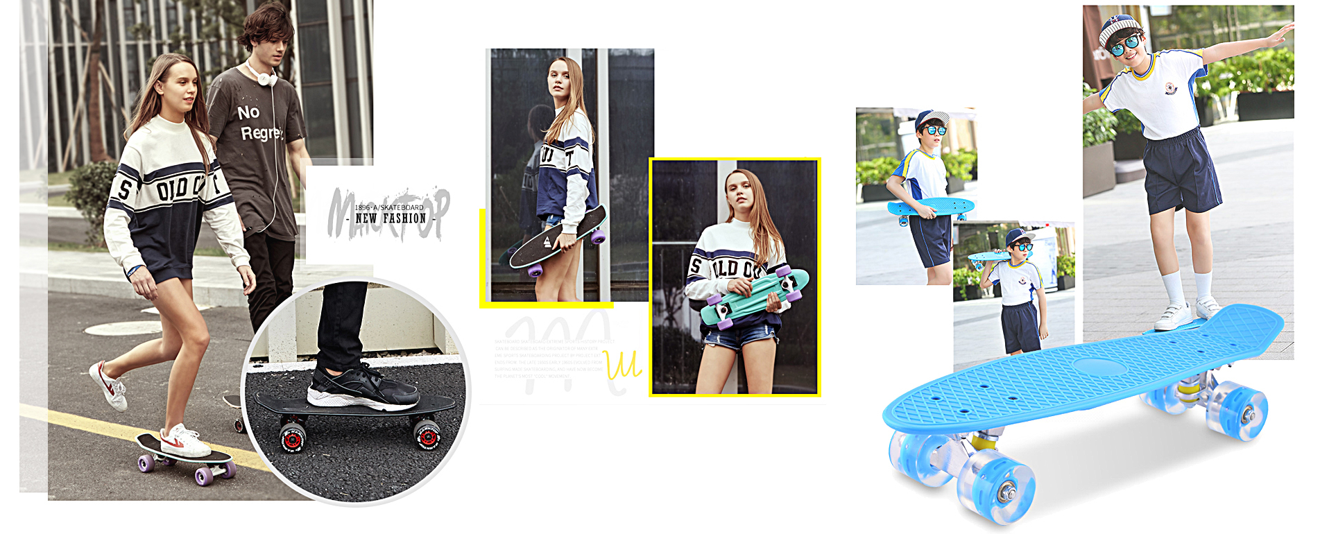 滑板家族一員,以其外表美觀小巧,輕便,通過性強獲得了很多滑手的青睞,很多人都用其作為代步工具,板面材質為ABS塑料為主,單翹,如上圖所示: