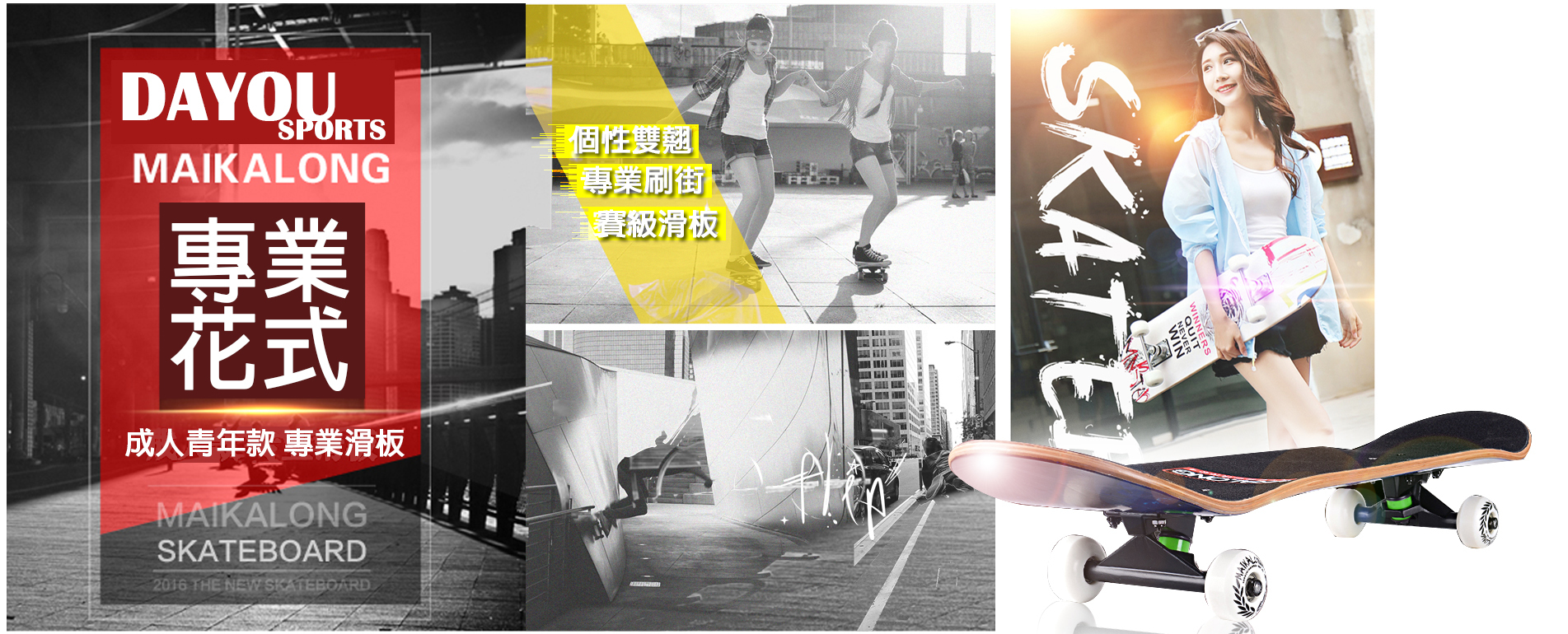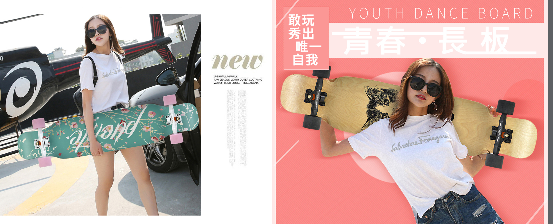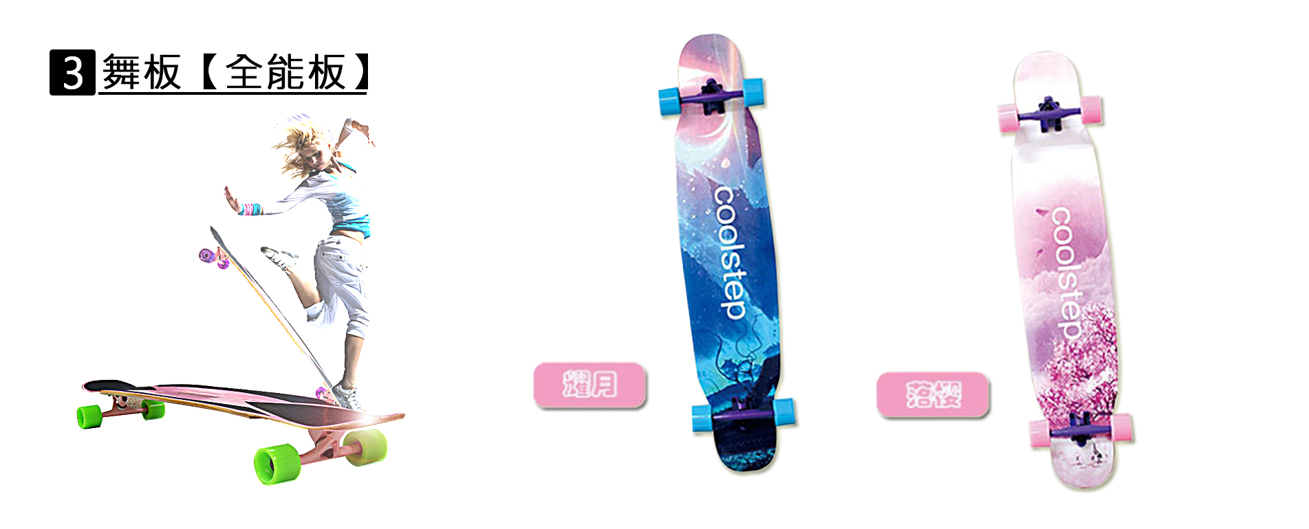 舞板特徵:雙頭微翹,長度一般有106cm和120cm兩種,材質有純楓木,竹木結合,混合剝離纖維等,輪子也是聚氨酯材料,硬度在65A-78A之間。