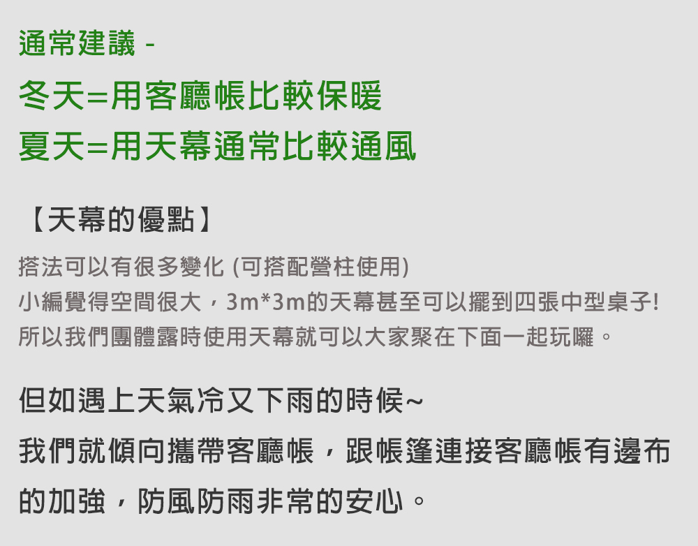 因為是「家庭露營」或「汽車露營」,講求直接開車到營區內,所以承重度&尺寸就非常重要。