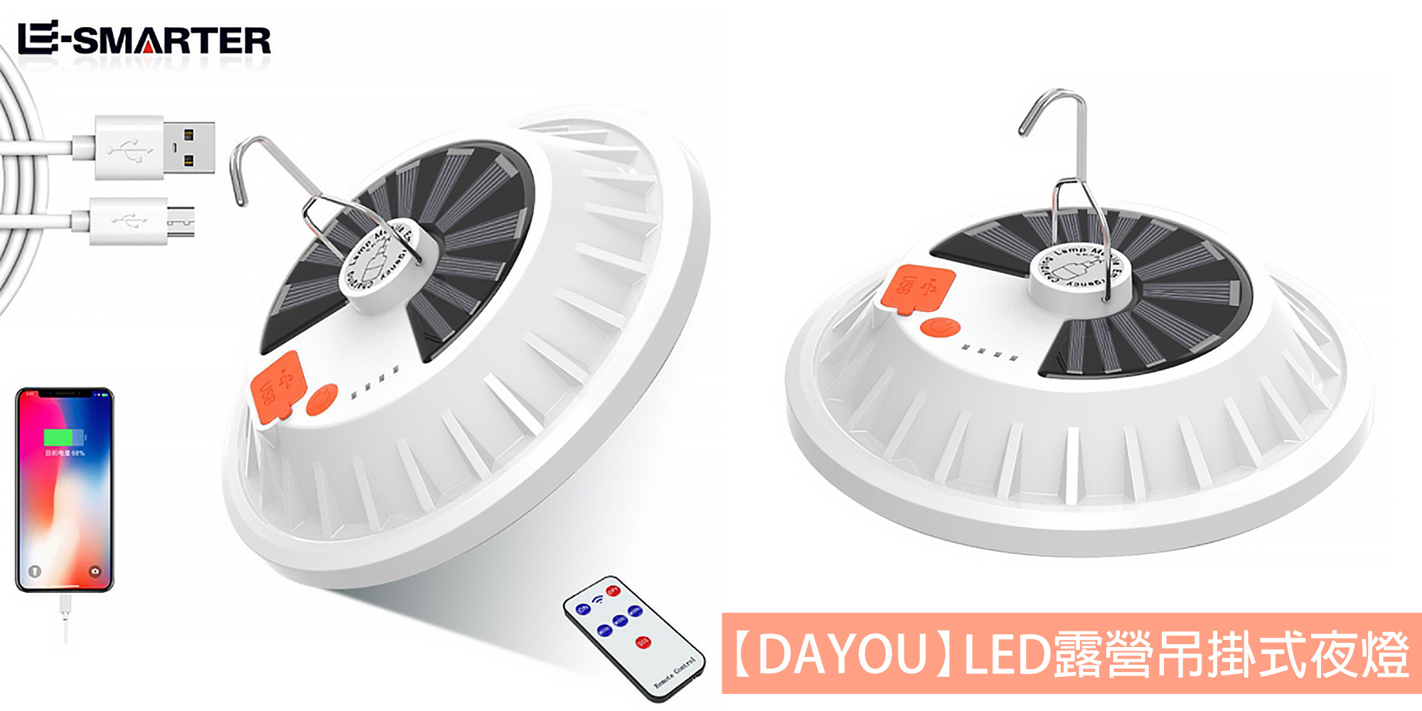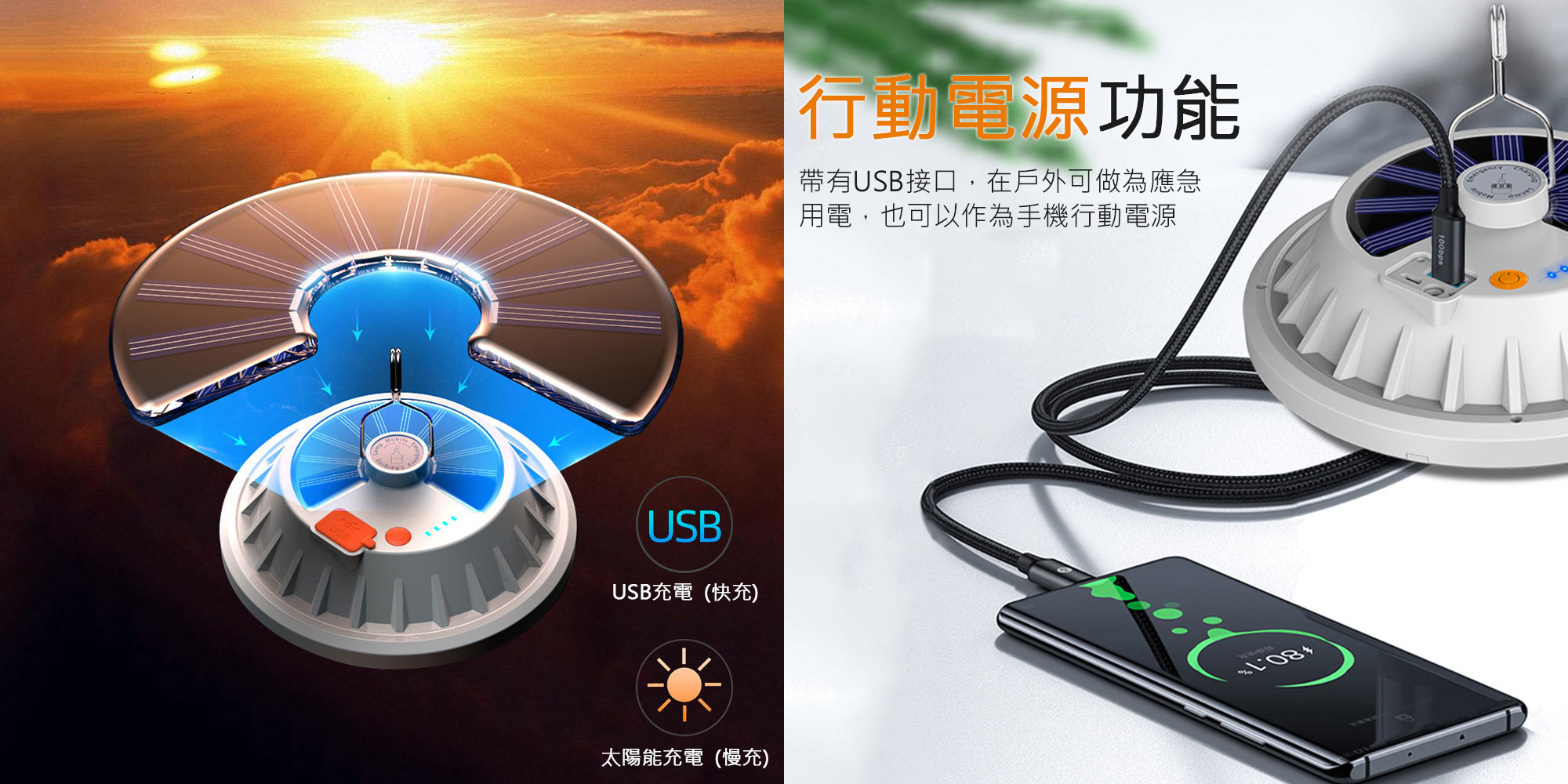 這款吊掛式飛碟露營燈則是跟後面三款有較多的區別,最讓人眼睛為之一亮的特點就是它有「防水防塵等級 IPX65」的功能,可以在水深不超過1公尺的情況下使用5分鐘。
