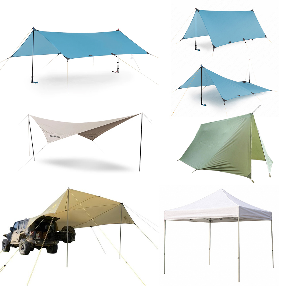 一塊天幕搭配不一樣的搭法、支架支撐的方式以及拉線方式就可以延伸出各種造型,不同用途的帳篷