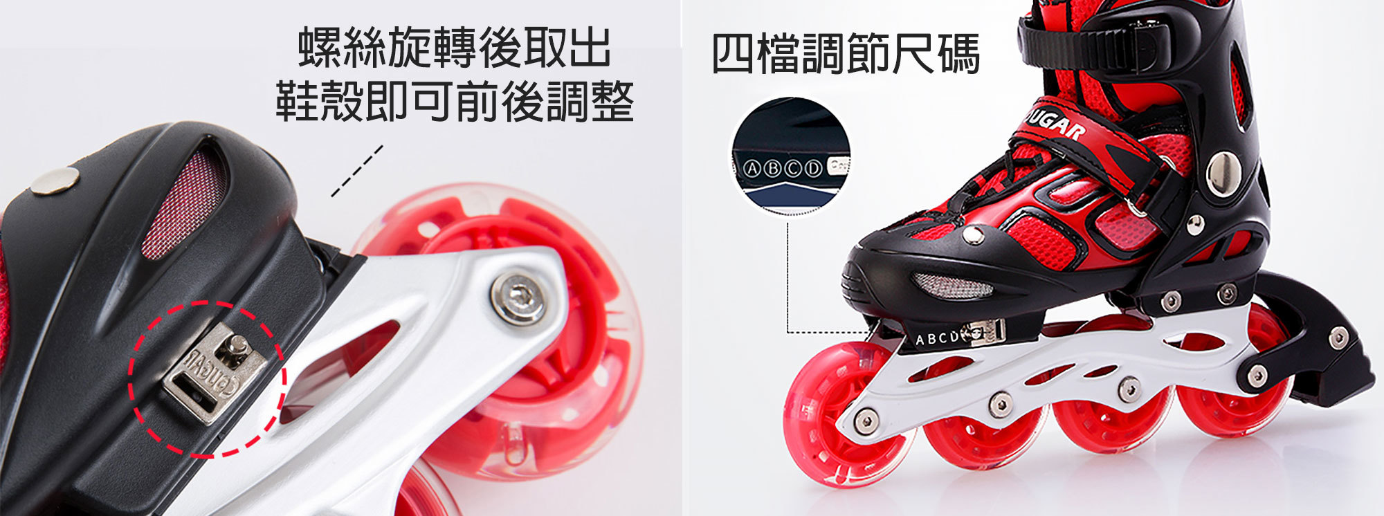 對於想要自學的孩子們來說~想要穿得舒服又想有點安全性,小編會推薦國際十大品牌之一的美洲獅 可調式休閒直排輪,安全性方面雖然不及美洲獅課程專用硬殼鞋,但不管是支架厚度還是支撐性依舊遠勝於市售賣場休閒鞋。