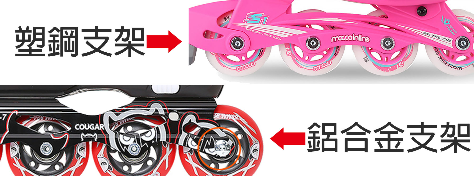鋁合金:鋁合金一體成型底座特性在於硬度高,力量反應直接,在速度、力量、靈敏度上的表現較好,一般使用在課程上的直排輪底座上以鋁合金最常見,也有塑鋼的,但塑鋼質材基本在強度上不太夠且放久有龜裂易脆化的問題產生。