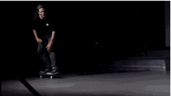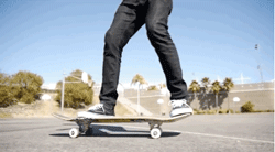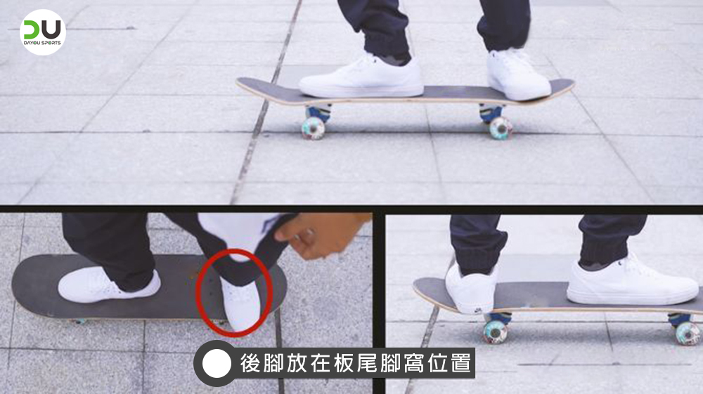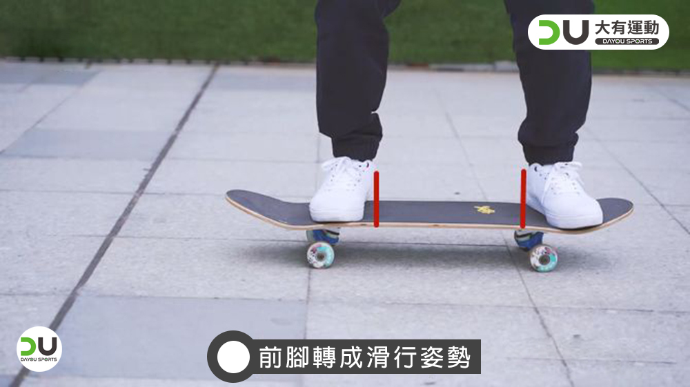 step.3 前腳向前,迅速放下滑板,前腳站在滑板前部,後腳往後蹬