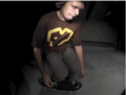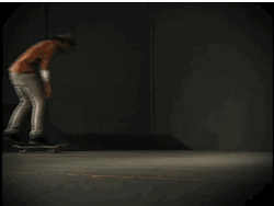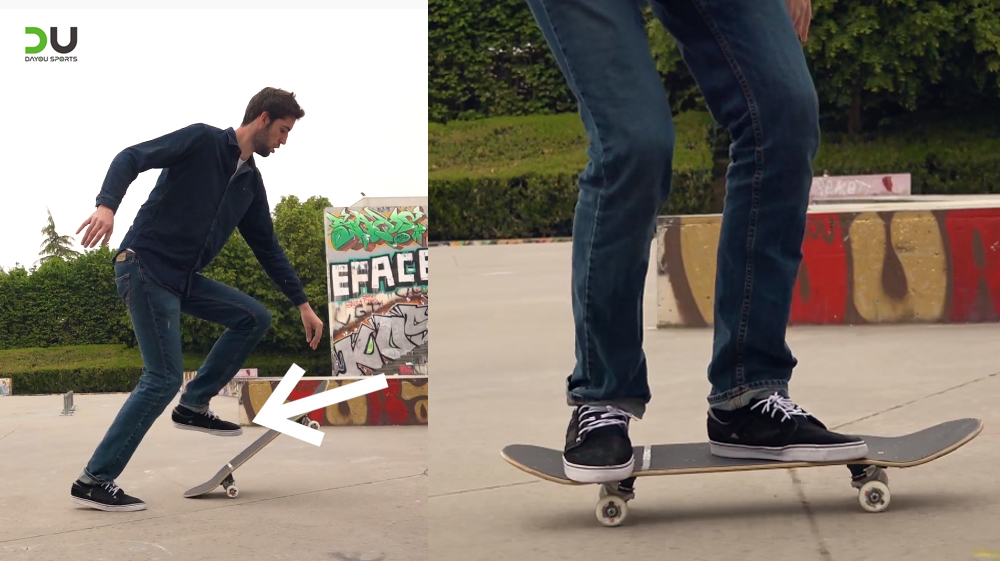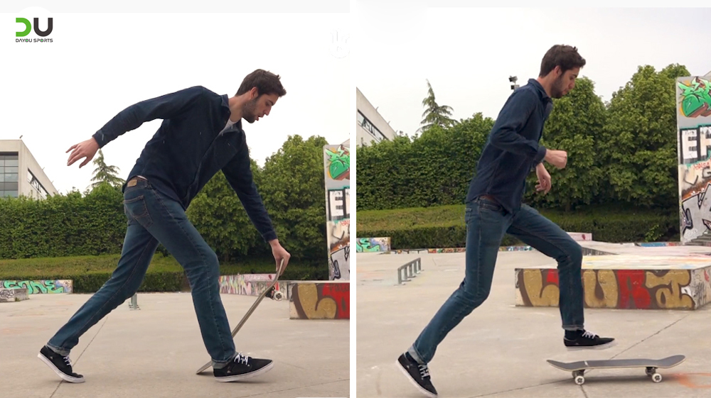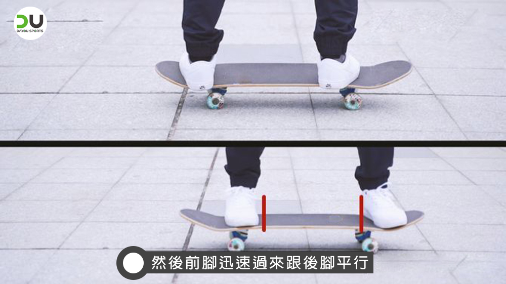 由原本應該踩在板頭的前腳,踩到了後面上板,另外一隻腳踩到前面,與Ollie的起跳動作相反。