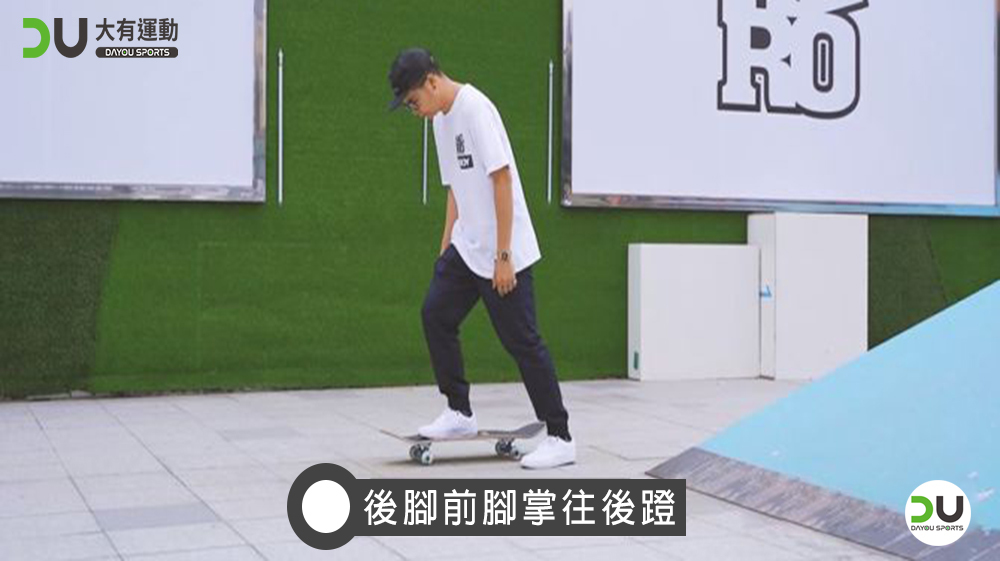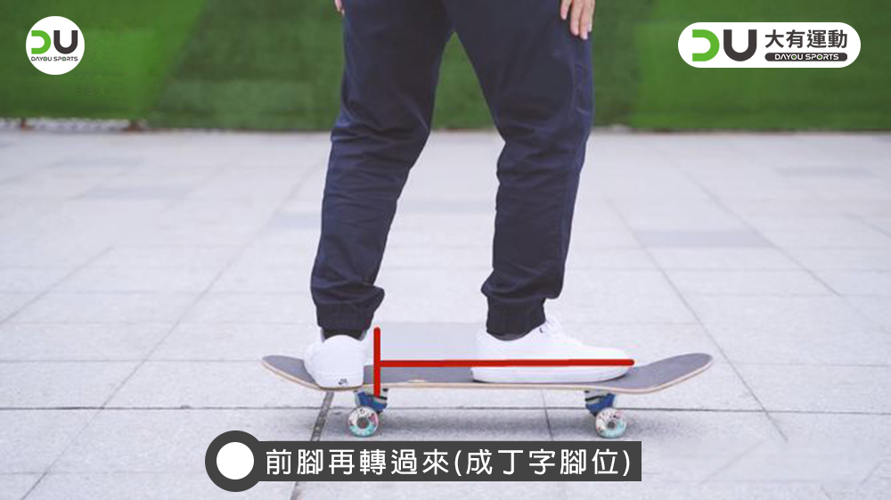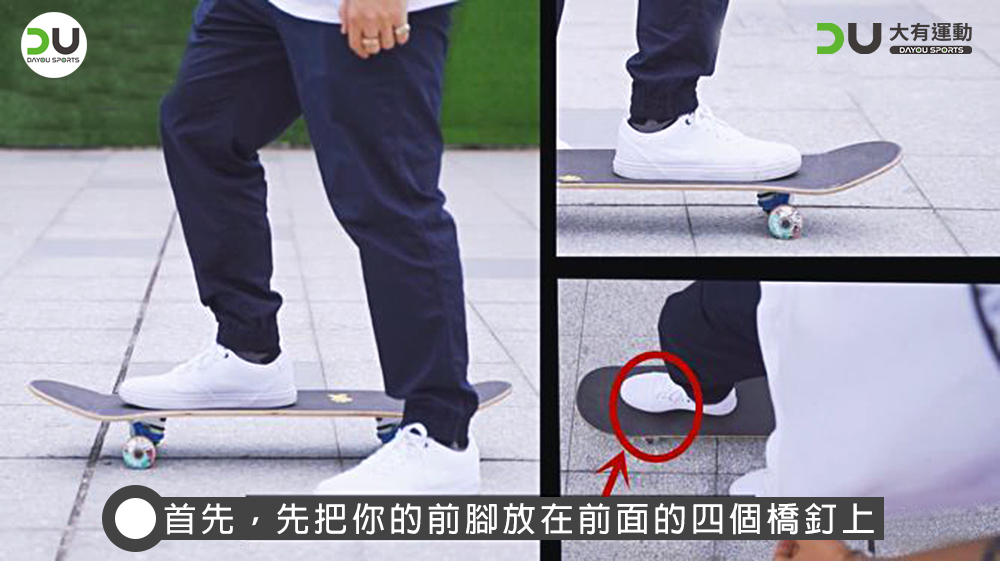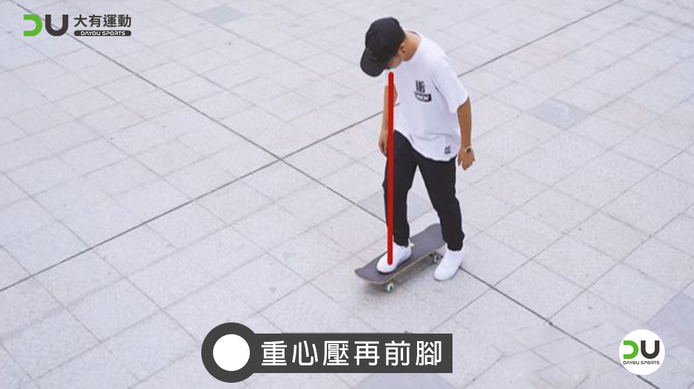 雙腳站在前後輪螺絲釘位置,可以使得雙腳間的距離更寬,更容易保持平衡。